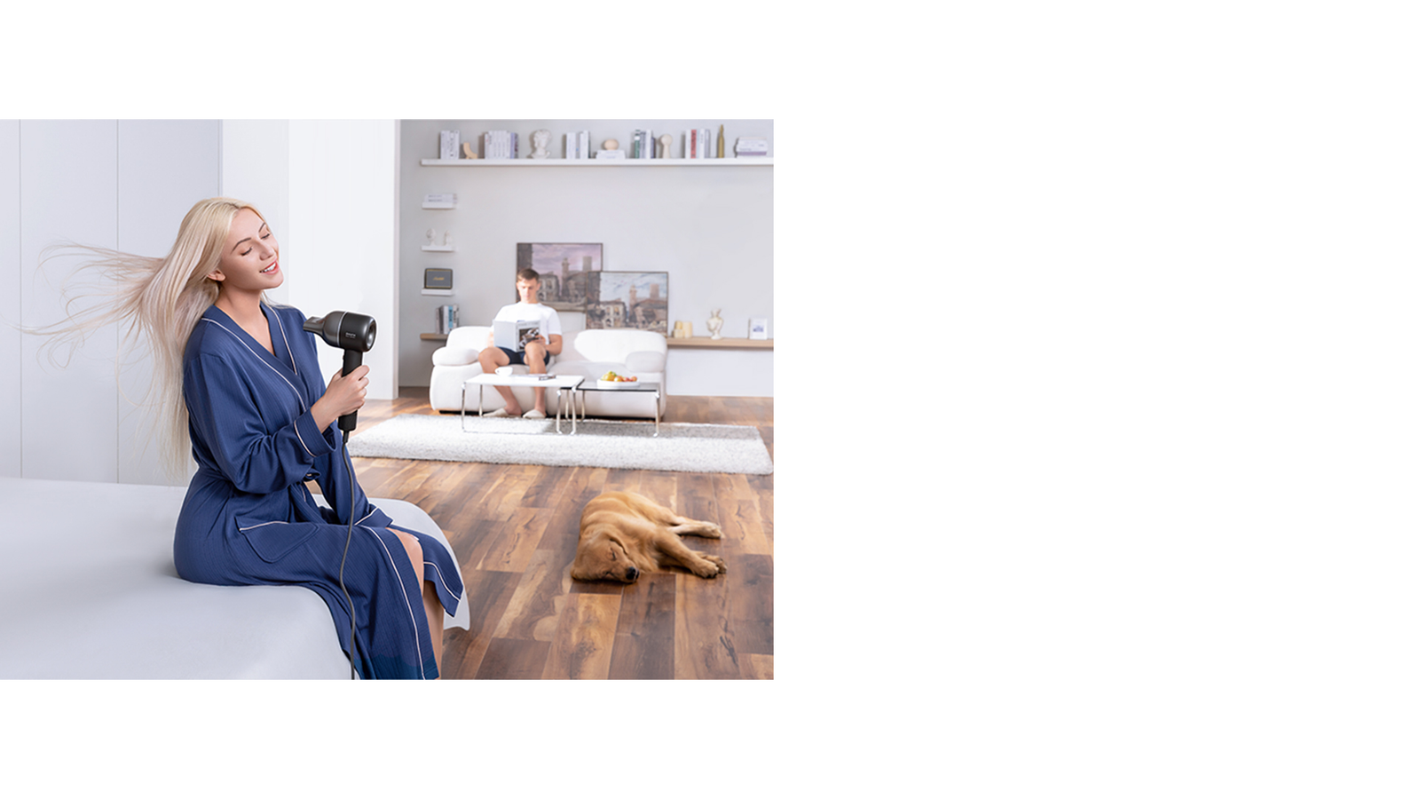Dry your hair with low noise to avoid disturbing others and still hear the world around you. Say goodbye to missing calls or messages because you were drying your hair. A high-speed brushless motor, impeller balance, and silicone suspension technology effectively reduce noise.