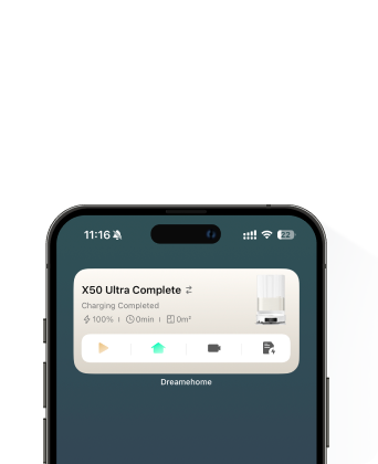X50 Ultra Complete's 6,400mAh battery provides up to 220 minutes* of cleaning in Quiet Mode, covering up to 205m²* on a single charge. When the battery runs low, it returns to the dock to recharge and resumes cleaning from where it stopped. Enjoy 30% faster* charging and the option for off-peak hour charging.