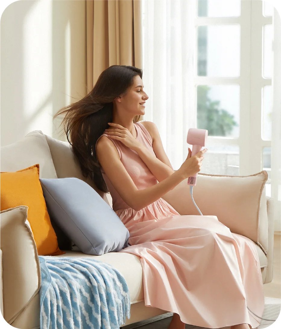 Give yourself a quiet and elegant ambience during the blowdry at a noise level of 59 dB*. The Dreame Hair Gleam High-Speed Hair Dryer utilizes an efficient air duct system design to reduce shaking and friction. Our hair dryer provides a peaceful blow-drying experience right for you.