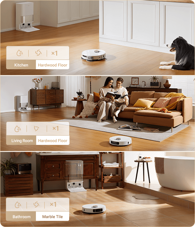 | Vacuum Only | Mop Only | Vacuum and Mop | Vacuum then Mop (lifts only when sweeping) | Recharging | Carpet Cleaning | Mop Drying | |