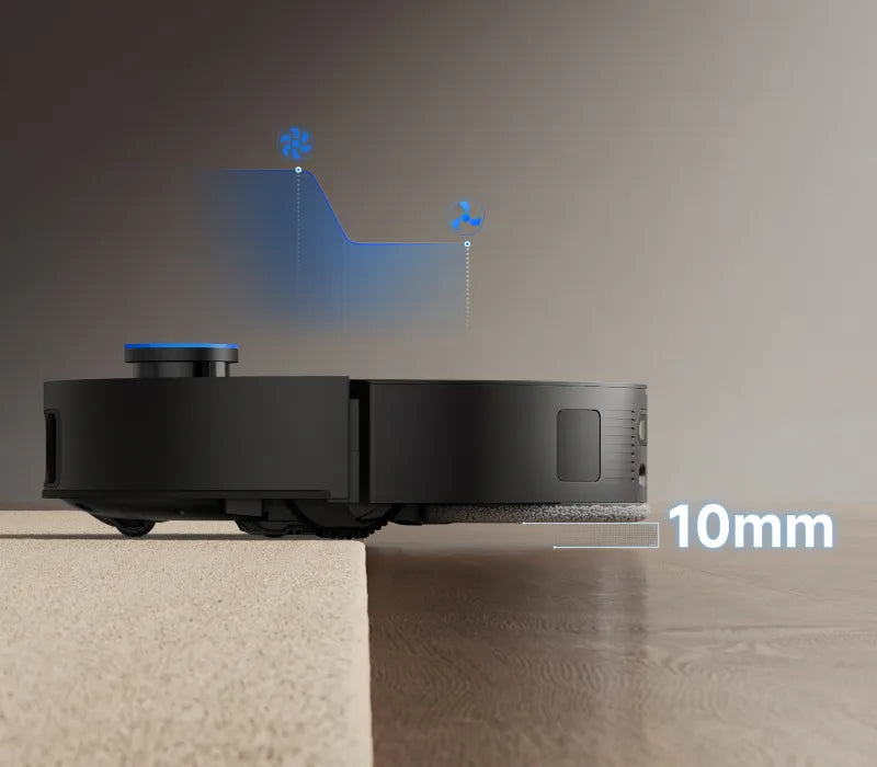 *10.5mm: Based on tests in our in-house lab. The height difference of the robot vacuum is 10.5mm before and after mop lifting.